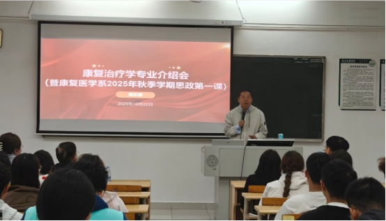 2025年10月22日,康复医学系25级新生专业介绍会暨“思政第一课”在广州校区B203顺利举行。党总支书记、系主任黄东锋教授主讲,党总支副书记刘静丽主持,系副主任谭杰文教授、专任教师、辅导员及25级康复治疗学全体新生参加。